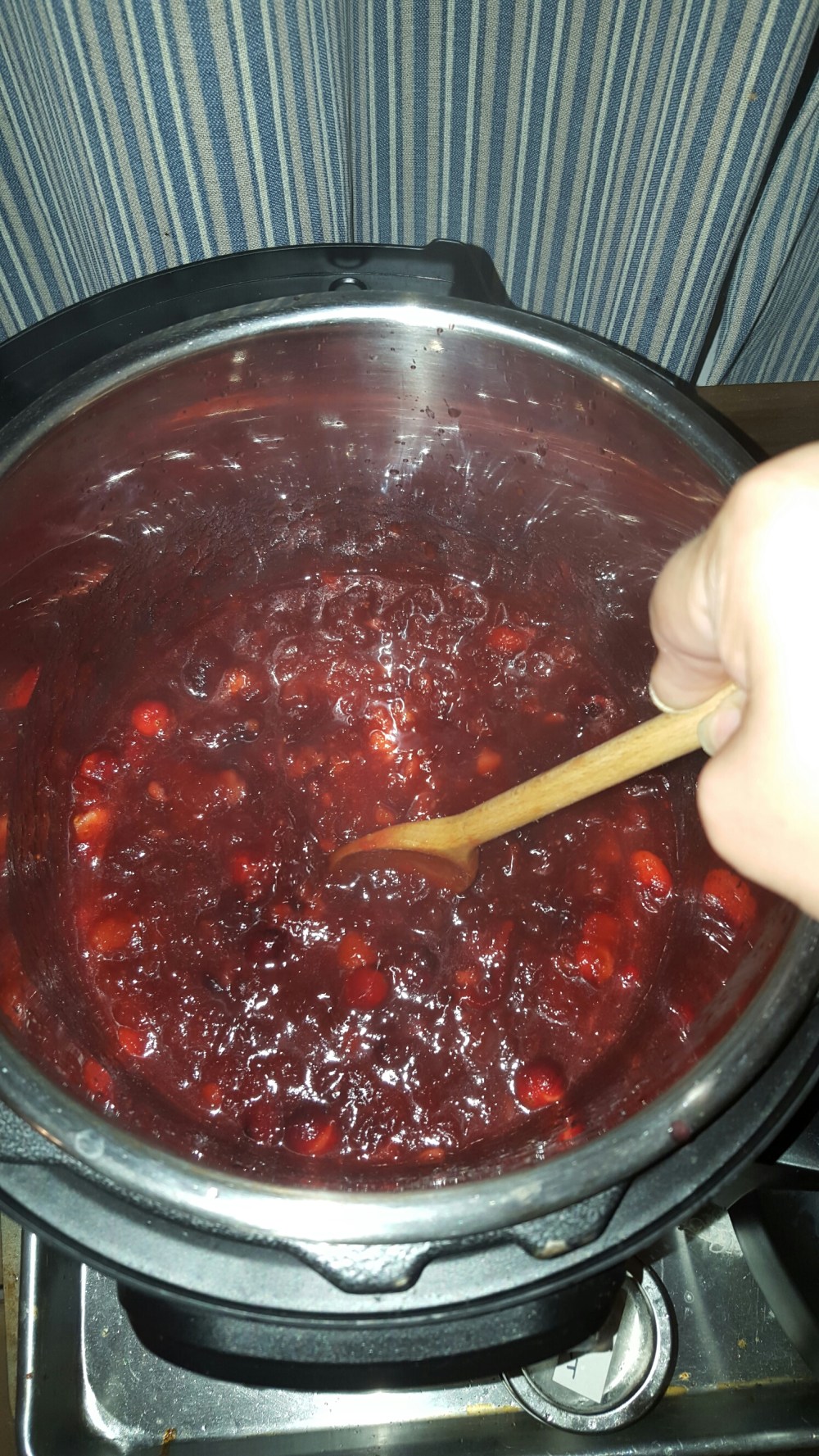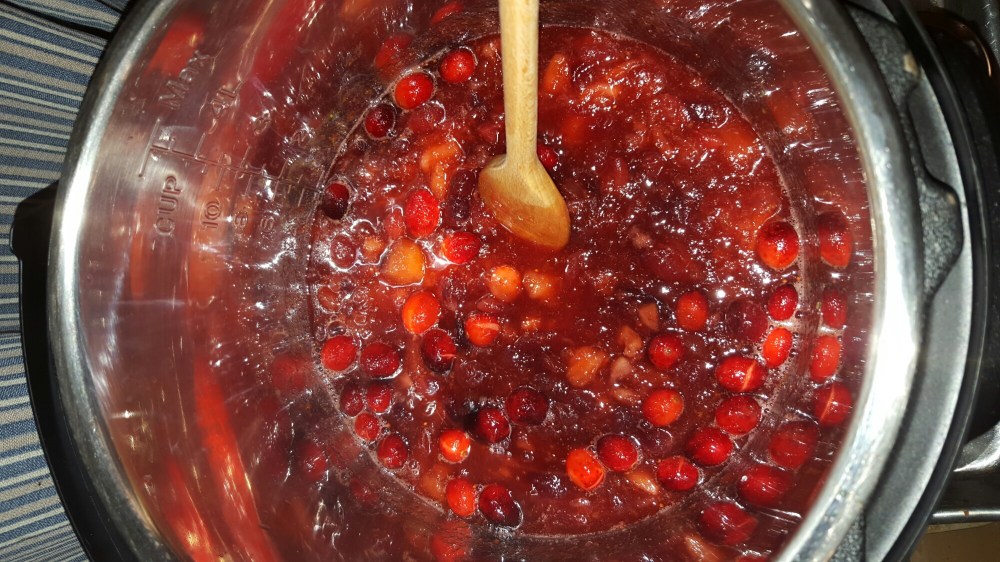 First you need a bag of good fresh cranberries. it has 12 oz in it. wash and dump the 10 oz into the pot, along with zest of 1 big orange and the juice. Add 1 large apple, cored, peeled , and diced. Throw in 1/2 cup sugar, a pinch of salt and 1 teaspoon cinnamon. put the pot in the base, closed the lid and vent, press manual 1 minute and walk away.
