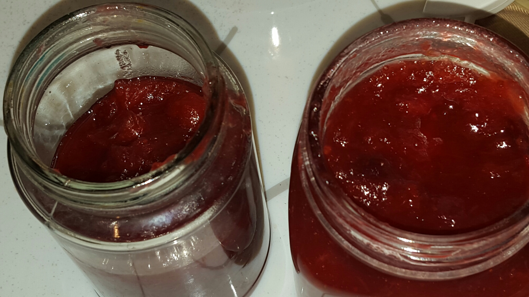 Once it beeped, let it sit 7 minutes. I actually let it sit 12 minutes because we were discussing about adopting a puppy and got carried away and forgot about my cranberries. But turned out it was still fine. Not burn or anything like that. I open the vent and lid and it looked a little loose. Add the remaining 2 oz cranberries and another 1/2 cup of sugar. Stir until those 2 oz cranberries popped. Stir for another minute or two and I was done. Perfect consistency and not too sweet and not too tart. It is so good that I can’t stop licking the spoon after pouring them in the jars. Now they are cooling down nicely. One big jar for Thanksgiving day. One smaller one for my breakfast in the morning with the yogurt I made last night in the Instant Pot.