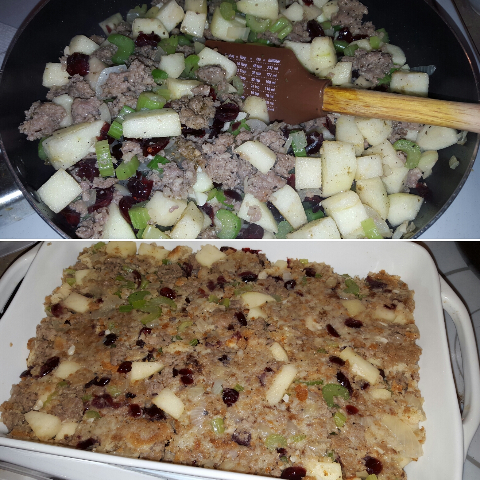 Basically just brown 1 lbs sausage , chopped onion an celery, sautee until the onion translucent and the sausage cooked through. Add dried cranberry and seasoning, the usual salt pepper and poultry seasoning, a lot coz I like the smell of sage in it, I added little more sage. Well then turn off the stove and add in the toasted bread cube or the prepacked Pepperidge stuffing. Mix and pour in chicken broth until you get the consistency you like..moist, not mushy. Pour into the pan, topped with butter and bake for 35 minutes. I add more broth as needed to keep them moist.