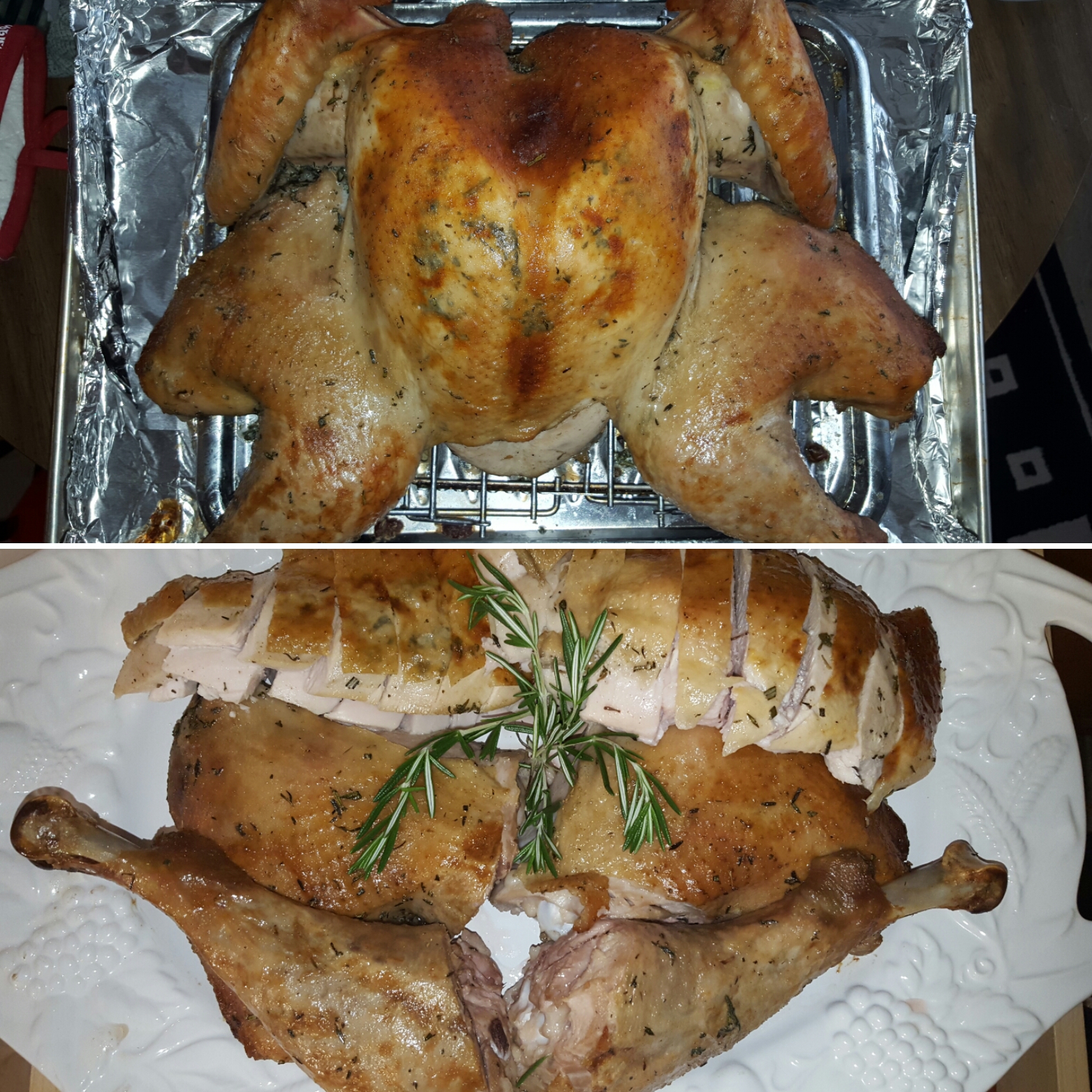 The next day, take them out, let it sit for 30 minutes then smothered them with the herb butter. Again inside out under the skin all over the turkey. Then baked in preheated 350°f oven for 1 1/2 to 2 hours until it reached 160°f on the breast part. Or when the juice in between the thigh and breast running clear when you cut them, that’s the old way to check the doneness of your turkey.