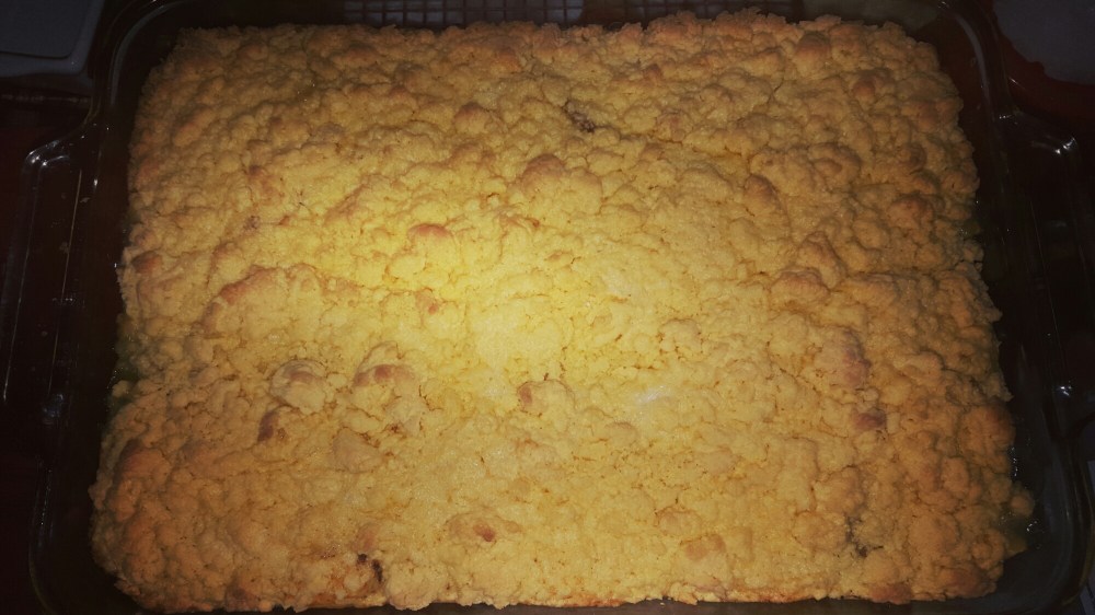 This is a very easy recipe ya’ll. 4 cans of those mango in lite syrup. Only use the syrup from 1 can. Discard the rest of the other syrups from those other 3 cans. No don’t throw away the mangoes!. They all go into a 9×13 Pyrex pan. Sprinkle cinnamon over them. Now get a mixing bowl, dump 1 yellow cake mix, 1 block of 8 oz creamcheese and mix them just until they are crumbly. Cover those mangoes with that mixture. Last, melt a stick of butter and drizzle all over the mixture. Baked in 350°f Preheated oven for maybe around 30 minutes until golden brown on top bubbly around the edges. Served them warm is best topped with cinnamon or caramel ice cream , which we did.