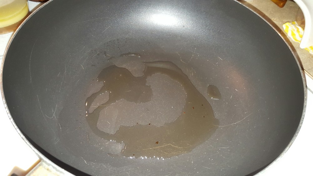 I heat up 1 tablespoon oil in the pan to fry my pork, just to get the charred on it. And reduce the sauce after I fry the pork.