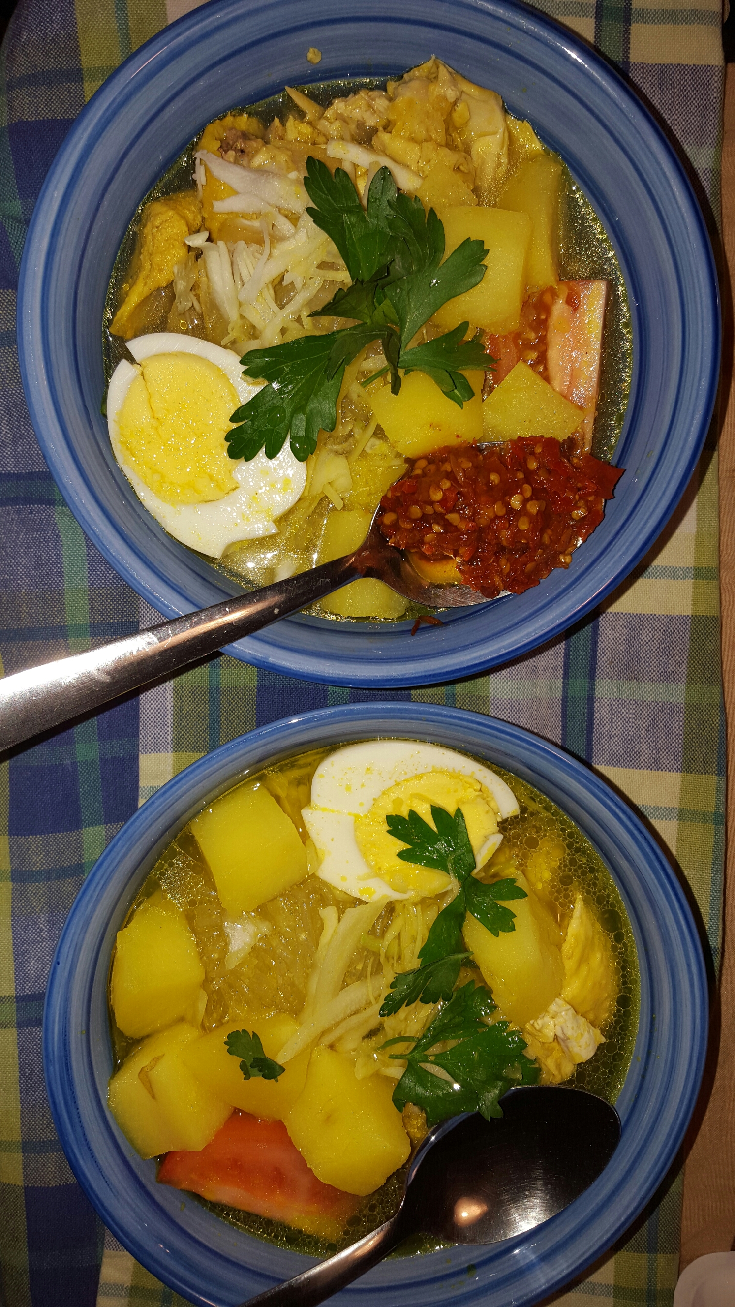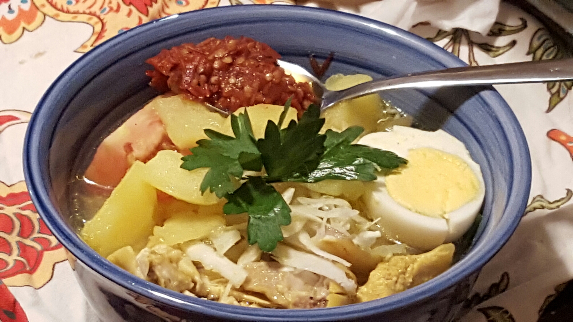 I serve the Soto in a bowl…arrange the rice, glass noodle , shredded chicken, shredded cabbage, sliced tomato, hard boiled egg and pour the broth over it with the potatoes Garnish with parsley and a wedge of lime to be squeezed into the soup.