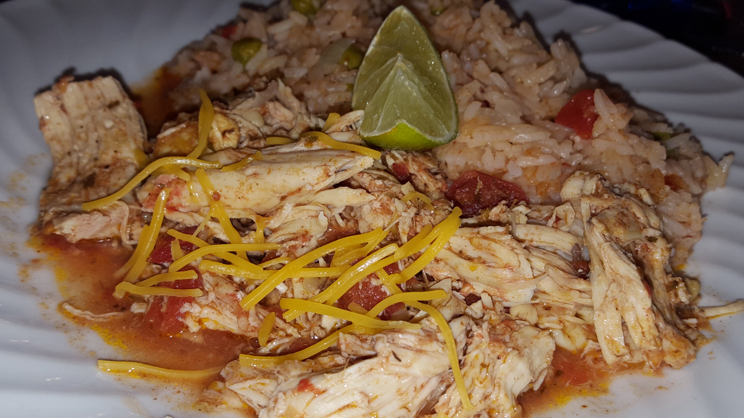 Serve the chicken with the rice and topped with shredded cheese and a squeeze of lemon juice.