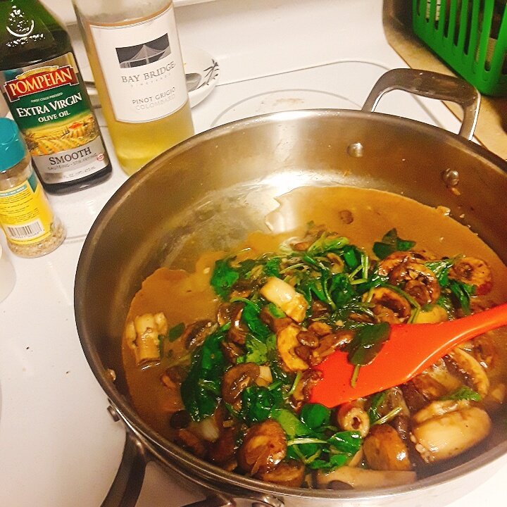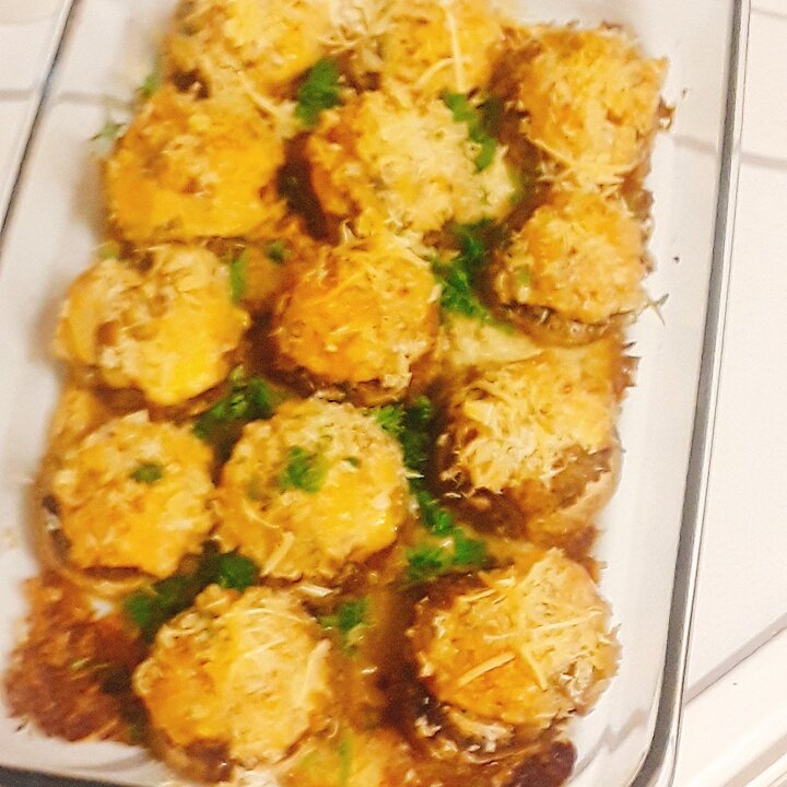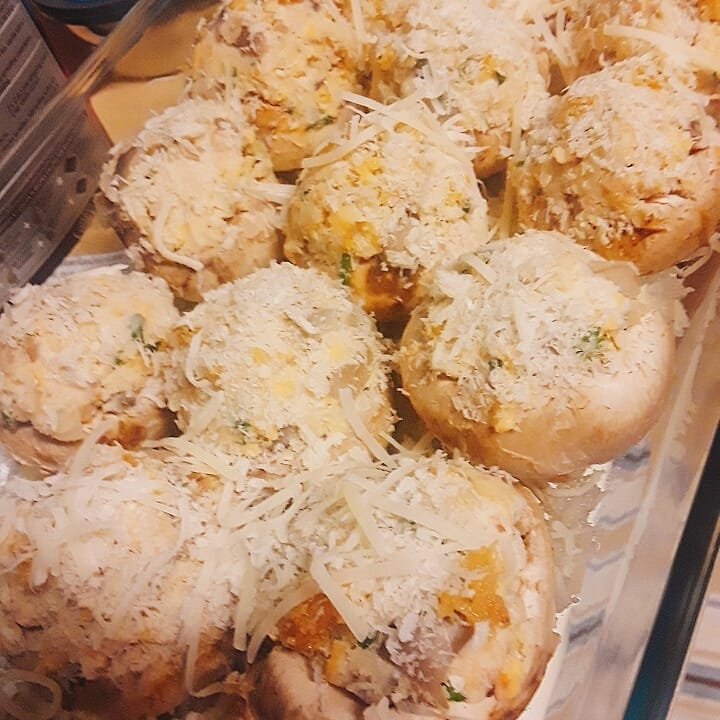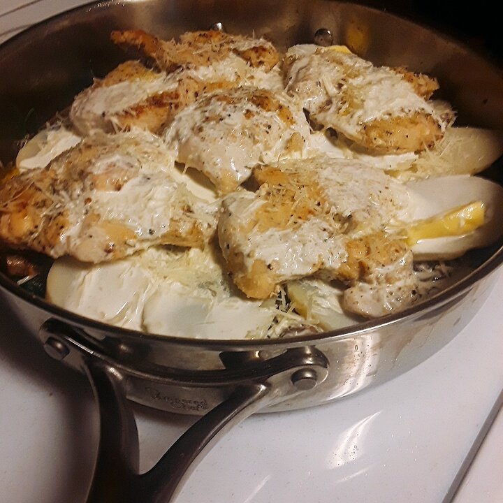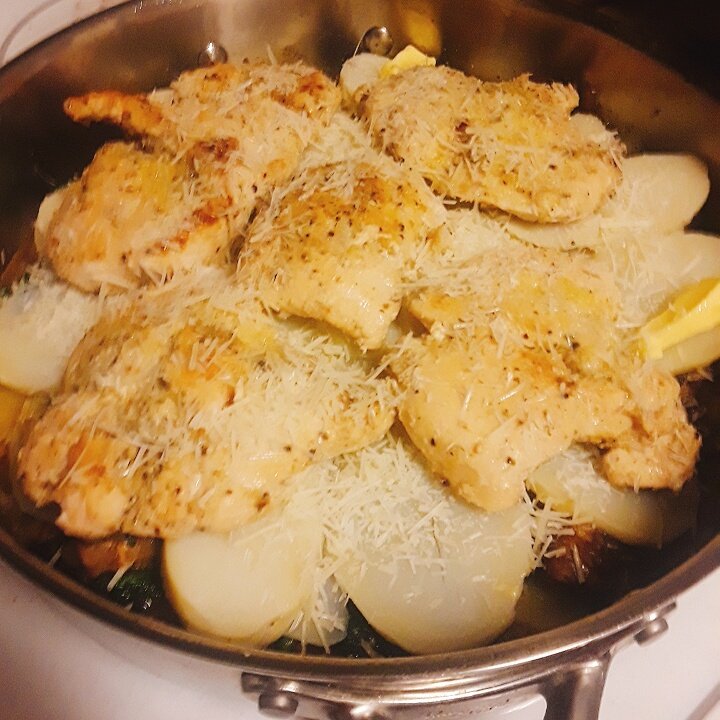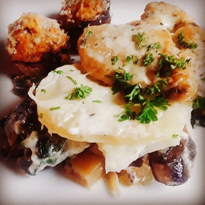 I had 2 russet potatoes that I had steamed in Instant pot for Christmas lunch and ended up not use them all. And I have some baby spinach that screaming to be use asap. Mushroom and leftover stuffed mushrooms filling. We love the scalloped potatoes and creamed spinach I made on Christmas day. So for our quick meal I decided to make both dishes with adding some sliced baby bella mushrooms and turn it into 1 pan meal. For the protein we add some chicken breast. Stuffed mushroom for the appetizer.