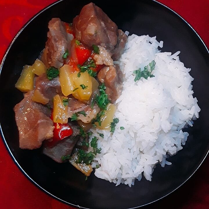 I cooked half yesterday in Instant pot. Adding a can of pineapple tidbits, red pepper, onion and garlic. Sautee in Instant pot, then pour the sauce mixture of the pineapple juice, low sodium soy sauce, brown sugar, salt and pepper. Serve with steamed jasmine rice. The pork cooked in Instant pot for 15 minutes. Here is the Hawaiian pork.