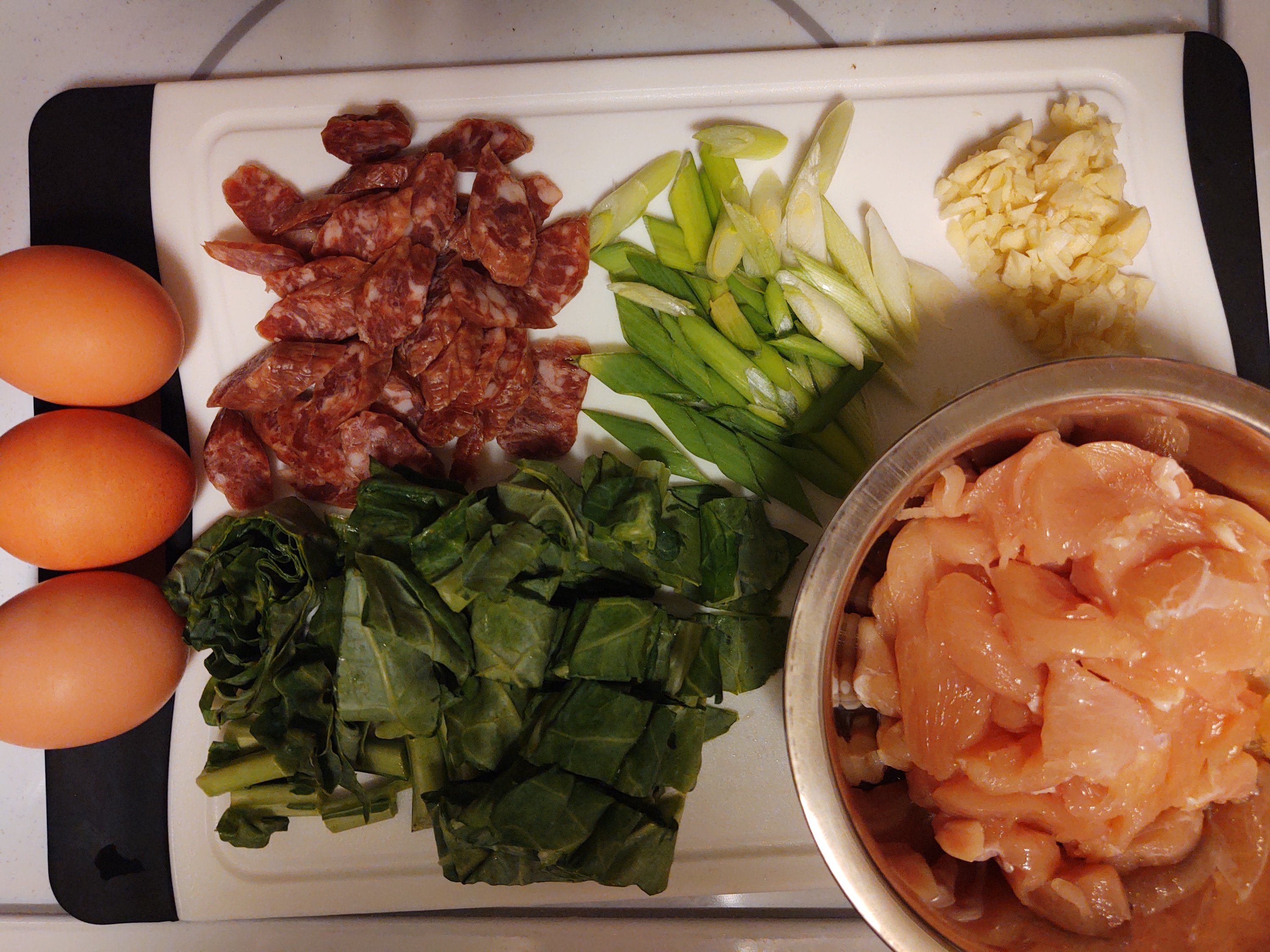 Ok I have this, I have Chinese sausage, chicken tenderloins, some greens, scallions, garlic…perfect, dinner is solved. So here is my take on bihun goreng.