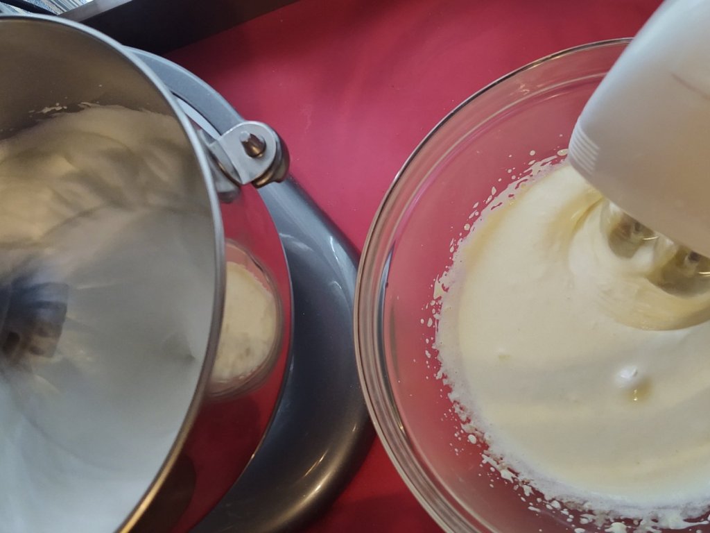 Yolks and flour mixture need to be smooth, no lumps. I used to use spatula to mix it. But now, to make sure it’s smooth, I use hand mixer. So while my KitchenAid busy whisking those egg white, I mix my yolks with the hand mixer.